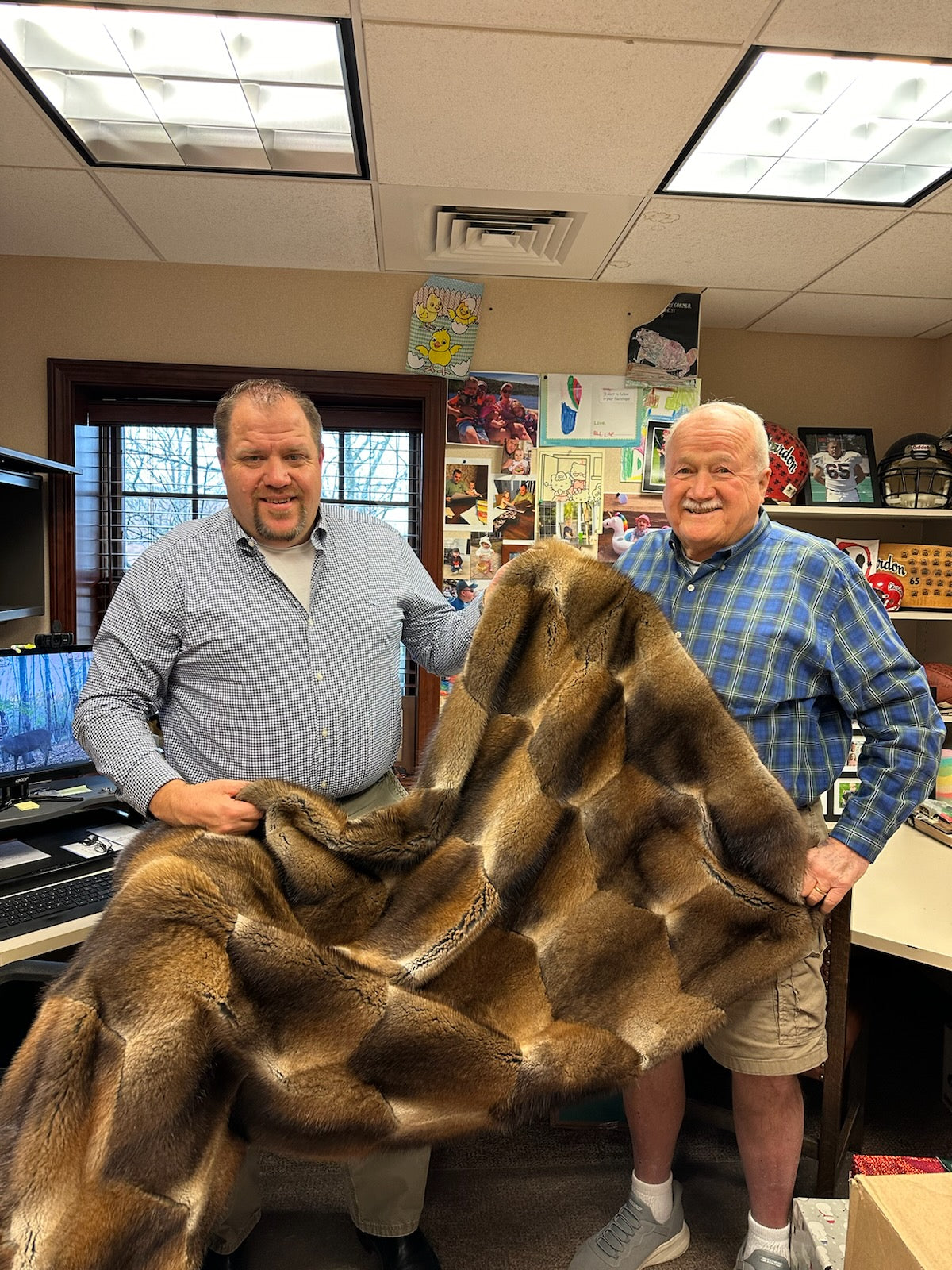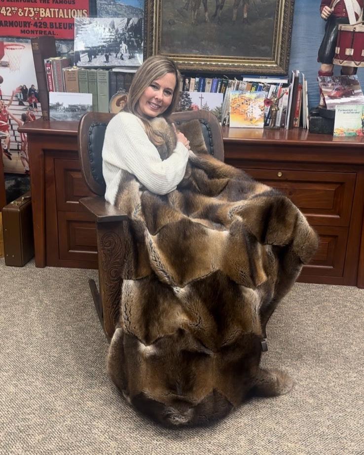 Our Muskrat Blankets are visually stunning blankets with color variations ranging from chestnut to golden blonde. Made from the pelts of muskrats caught under the ice in late winter months for the finest dense underfur, our muskrat blankets are luxuriously soft and lightweight. They are backed with sumptuous velvet and embroidered with the Adirondack Beaver Blanket logo.